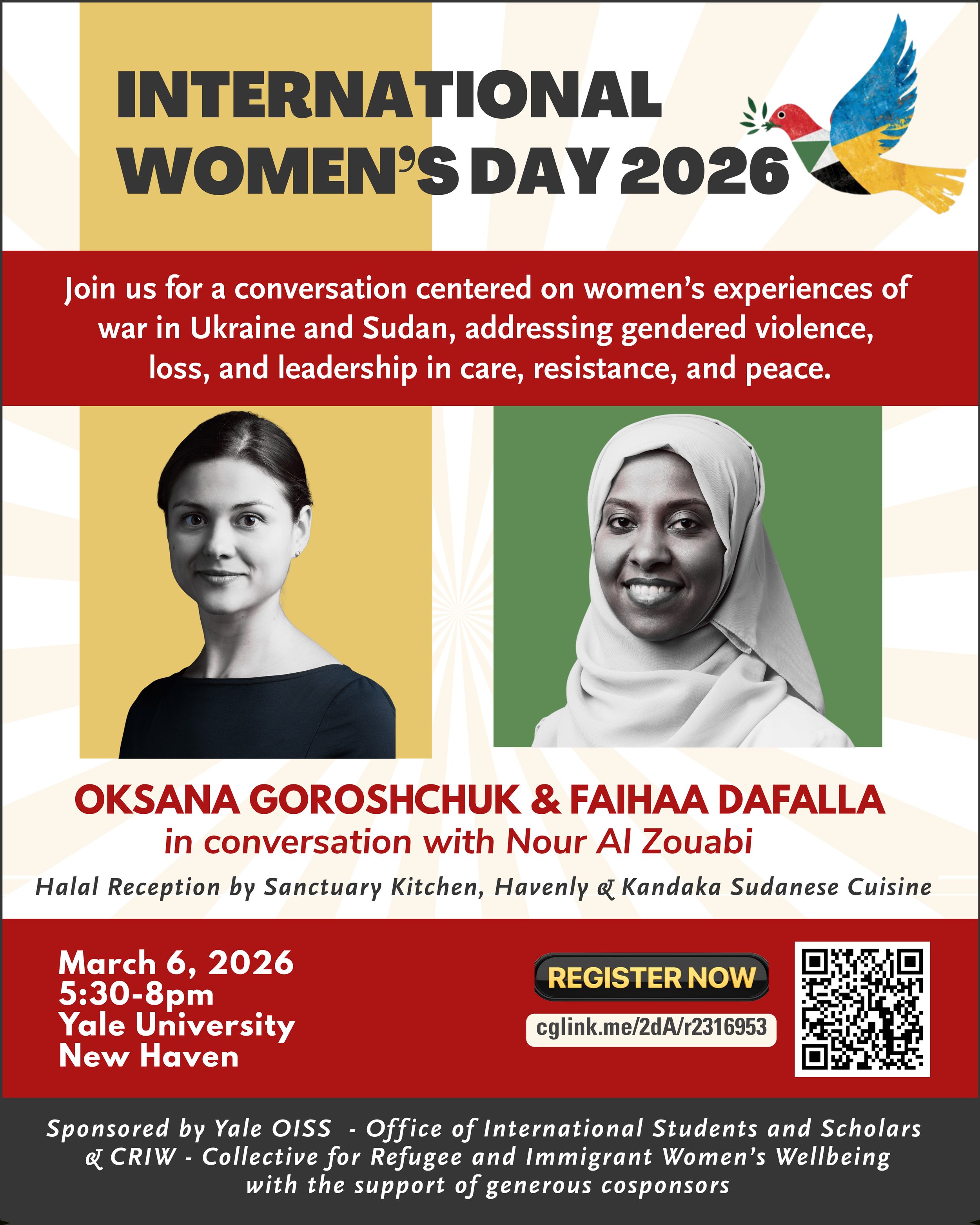 Event Co-Sponsors: CitySeed’s Sanctuary Kitchen • Elena’s Light • Havenly • JCARR – The Jewish Community Alliance for Refugee Resettlement • Ukraine House at Yale • Yale Chaplain’s Office • Yale Council on African Studies • Yale Council on Middle East Studies • Yale MacMillan Center • Yale Postdoctoral Association Belonging Committee • Yale School of Medicine – Office of Global Health Education • Yale School of Public Health • Yale Slavic Chorus • Yale University Church • Yale Working Women’s Network